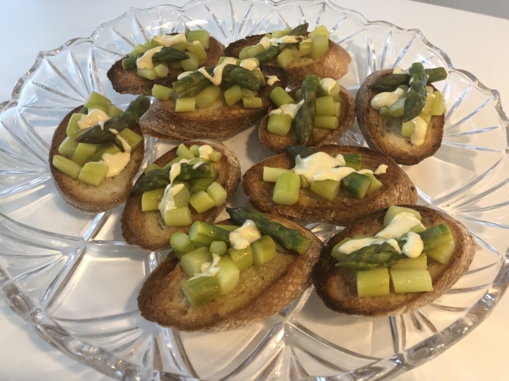 Sekoita oliiviöljy ja sitruunamehu keskenään. Sekoita majoneesi ja Dijon keskenään. Laita uuni kuumenemaan 250C. Kuori parsat ja poista reippaalla kädellä puiset osat. Kiehauta vesi ja lisää suola. Keitä parsoja 3-4 minuuttia. Varo ylikeittämästä parsoja. Nosta parsat reikäkauhalla puhtaan pyyhkeen päälle jäähtymään. Paloittele jäähtyneet parsat, mutta jätä nuput ehjiksi. Laita parsat marinoitumaan oliiviöljy-sitruunamehuseokseen 10 minuutiksi. Leikkaa leipä sopivan kokoisiksi paloiksi. Voitele oliiviöljyllä. Kuori ja halkaise valkosipuli ja hiero sitä leipiin. Paista leipiä uunissa 3-4 minuuttia, niin että ne ovat hieman rapeutuneet. Asettele parsat leipien päälle ja mausta majoneesi-Dijon seoksella. Tarjoa heti.