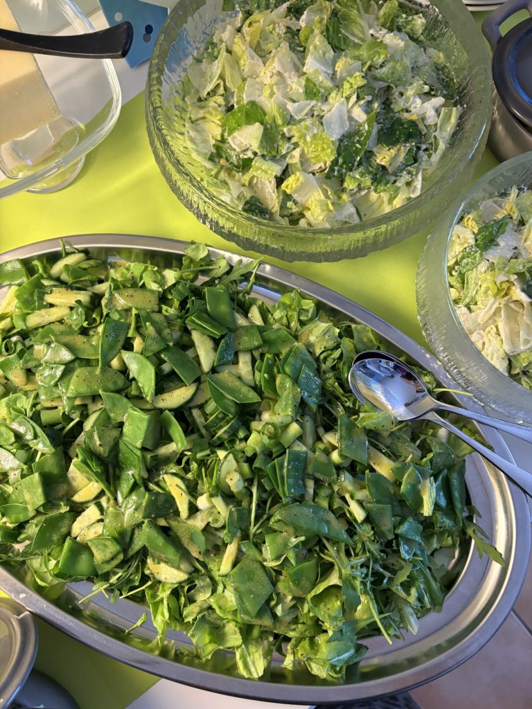 Salaateiksi valikoitui alla oleva vihersalaatti ja lisäksi laitoin tarjolle neljä pussia Pirkan Caesar salaattia valmiiksi tehtynä. Ihan kaikkea ei tarvitse mielestäni itse tehdä, aina voi sopivasti oikaista ja miettiä omia voimavarojaan.