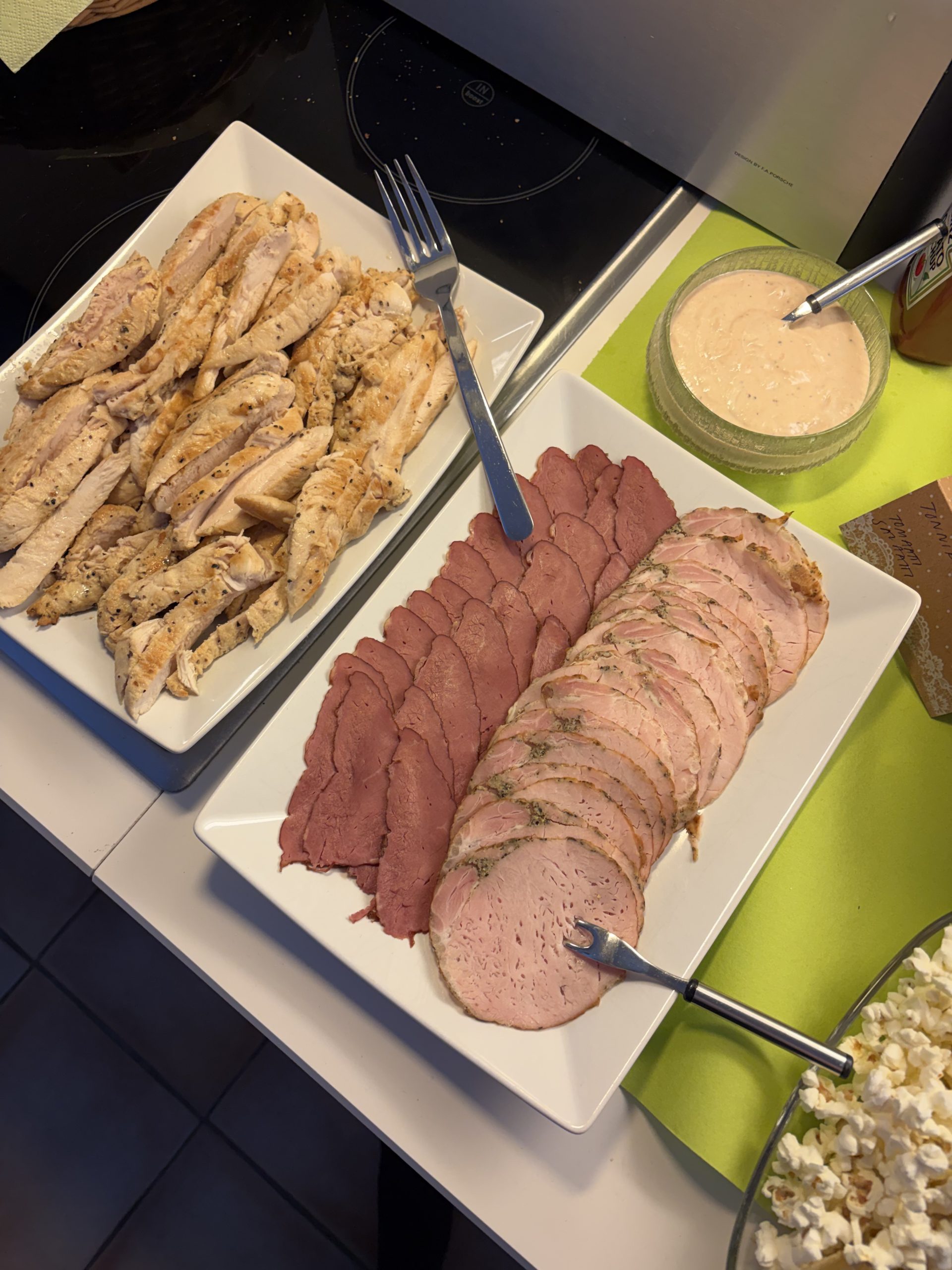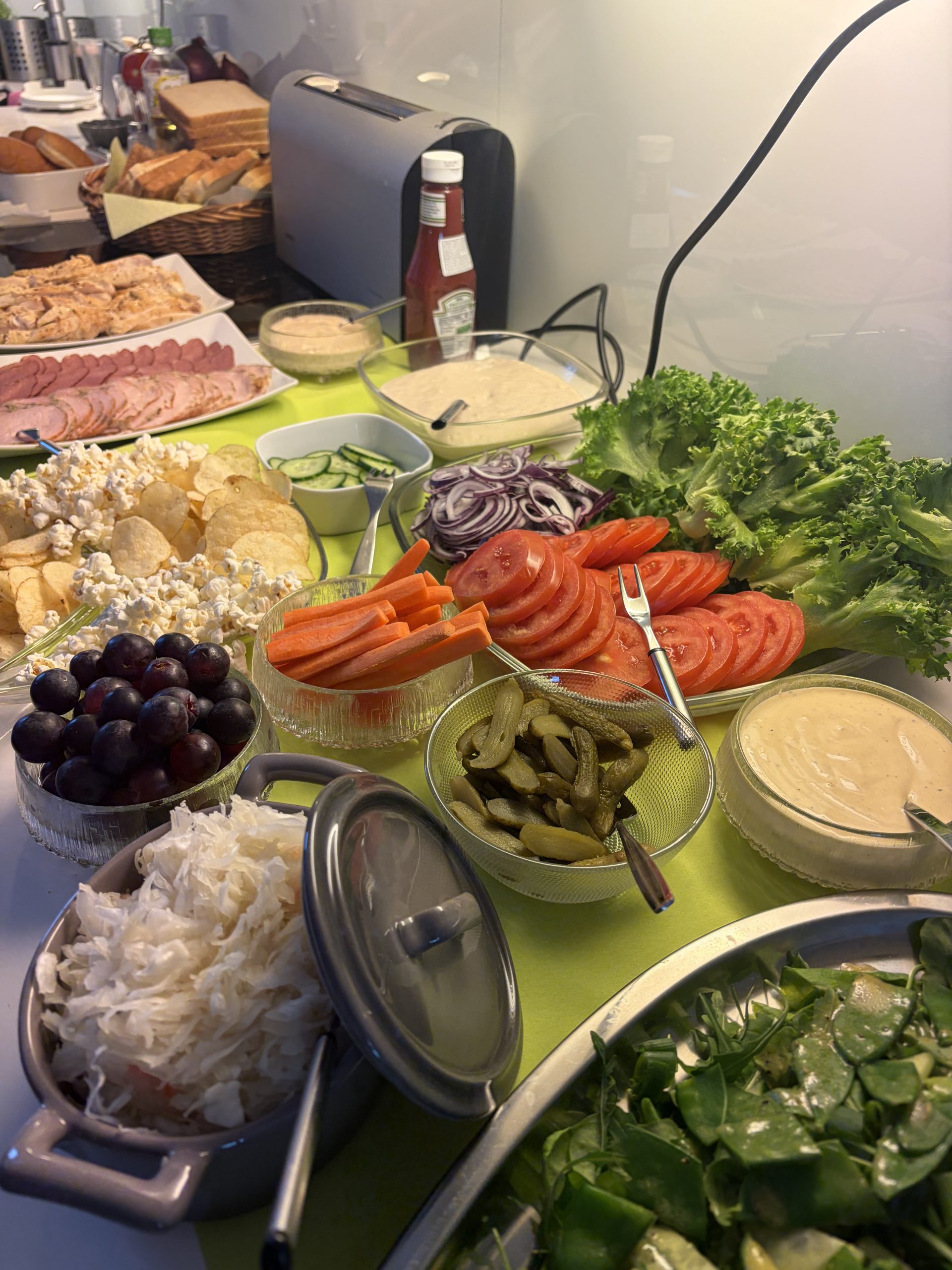 Tähän teemaan salaattien lisäksi alkoi valikoitua kaksi voileipää, Club sandwich sekä Reuben sandwich. Lisäksi halusin että tarjolla on myös kalaa ja kasvista. Kalana voileivissä toimi tonnikalalevite ja kasvisleipää varten varasin mozzarellaa, tomaattia ja jääsalaattia. Lisäksi teeman mukaan laitoin tarjolle popcornia ja sipsejä.