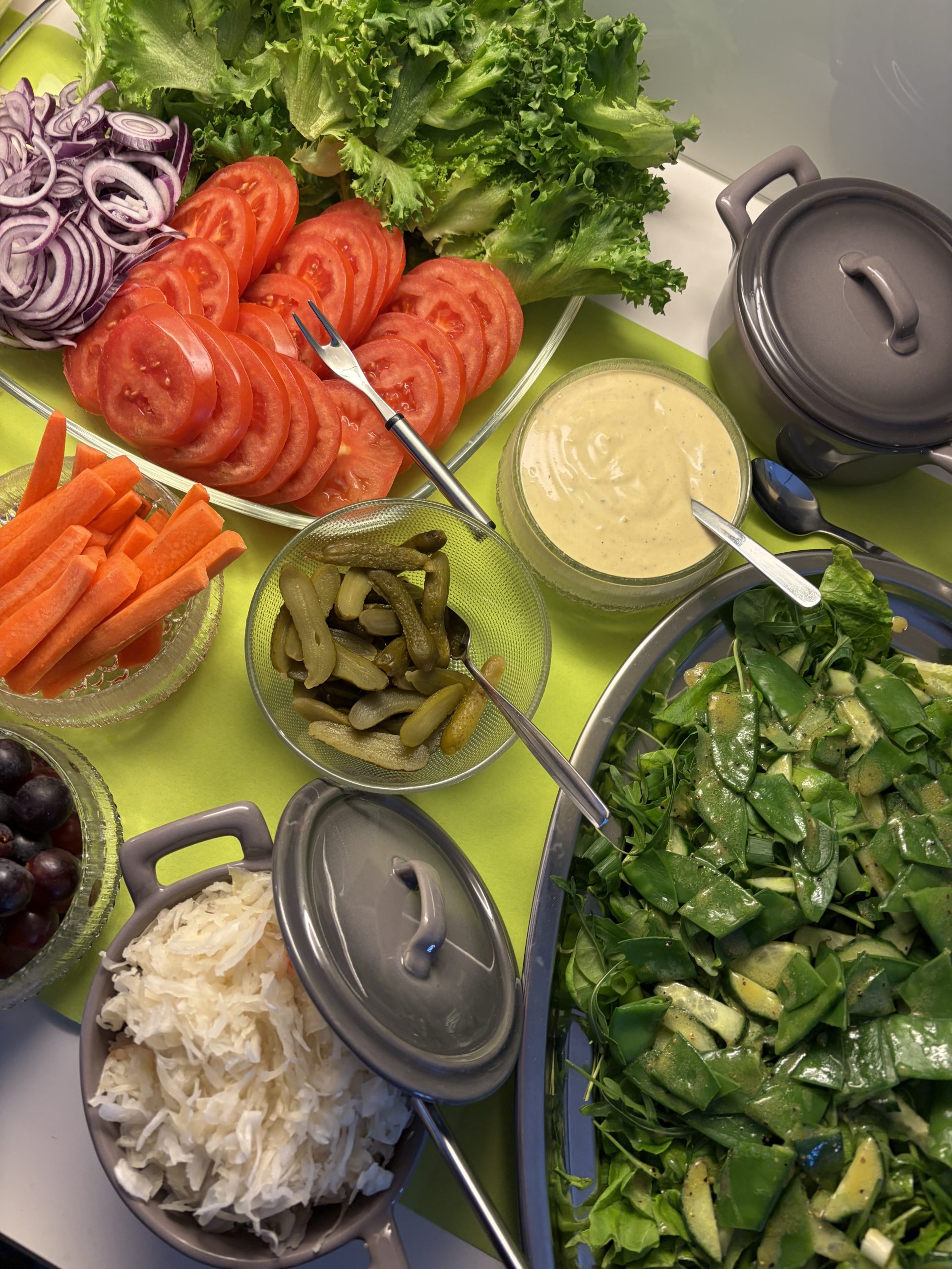 Juhlimme kahdesti vuodessa poikien syntymäpäiviä kotonamme noin 20 vieraan voimin. Ja kuten aina, ihmisillä on erilaisia ruokavalioita ja ruokatottumuksia. Pyrin aina valmistamaan ruuan siten, että kaikki löytävät jotain syötävää ja parasta on, jos kaikki voivat itse koota oman annoksensa oman ruokavalion ja makutottumusten mukaan. Suurin osa vieraistamme tulee matkan takaa, joten tarjoan aina kunnon ruuan, koska minulle suurin kauheus olisi, jos luotani lähdettäisiin ABC:n kautta kotiin… Tällä kertaa juhlien teemana oli Golf lapseni toiveesta ja keksin ja valmistan menun aina kulloisenkin teeman ympärille. Hetken aikaa ruokaa mietittyäni alkoi päässäni hahmottua buffet, jossa olisi voileipiä kuin Golf Clubilla ikään ja myös salaatteja, ja niiden tulisi kaikkien olla vihreitä teeman mukaan. Lisäksi osa vieraistamme on vielä hyvin nuoria lapsia, heille tarjosin perinteisesti hodareita, jotka sopivat kyllä teemaan sekä kasviksia valmiiksi viipaloituina.